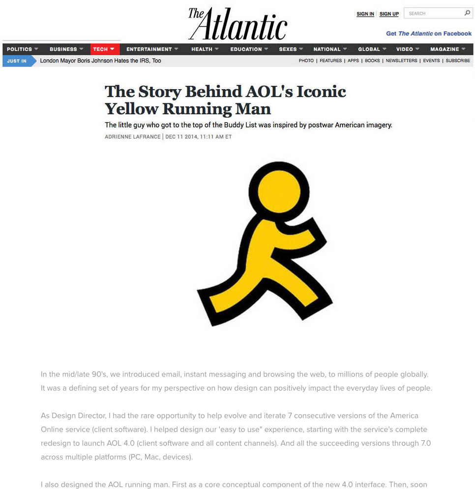 I designed the AOL Running Man in 1996. Warm colors, a yellow figure carrying a heart for favorites, a globe for the internet. The dominant paradigm was dense, blue, technical. I designed for people who'd never been online before. Their anxiety, not the technology's capability. Three people approved it. It reached hundreds of millions of users. I still don't know if it was good. I know it worked.